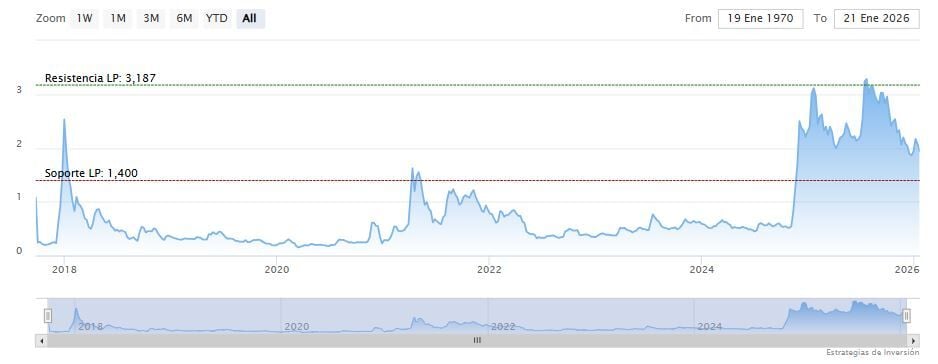 La resistencia a mediano plazo se encuentra en los 2.58 dólares. Mientras, los indicadores de Ei se muestran mixtos.