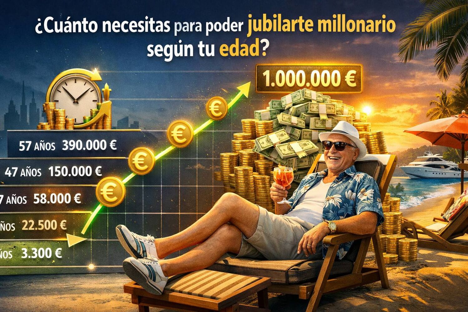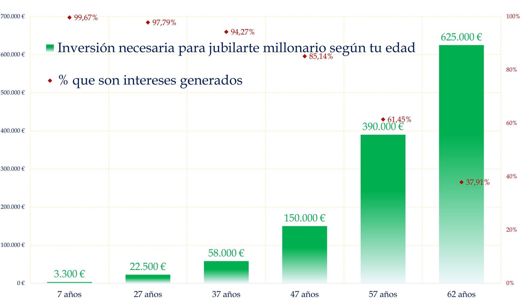 Como bien sabes, el interés compuesto y el tiempo son las claves necesarias para que puedas jubilarte millonario. Ahora bien, depende totalmente de la edad que tengas. No es lo mismo empezar a invertir con 60 años, que con 30, o que hayan invertido un dinero en tu cuenta cuando eras niño. Y de eso depende el tiempo que necesitas.