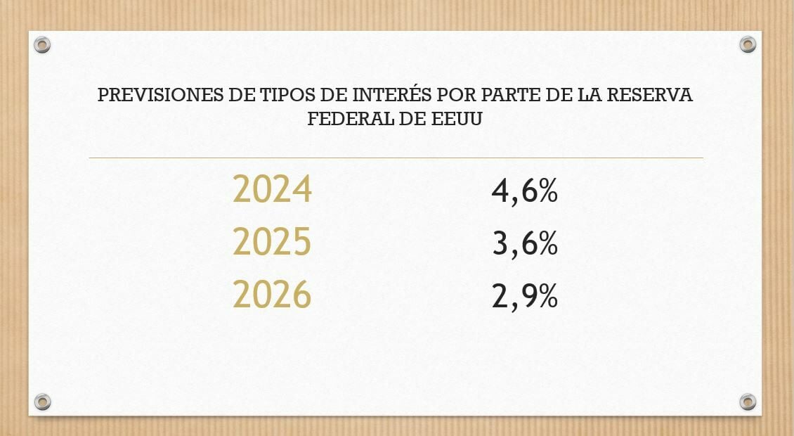En concreto, la Fed prevé que, a finales de 2024 los tipos de interés en Estados Unidos se coloquen en niveles en torno al 4,6%. Eso colocaría la tasa media entre el 4,5 y el 5% de variación. Y supone un recorte previsto e inicial, en estos momentos de 75 puntos básicos a una media de recortes de 25 puntos básicos en cada uno de tres reuniones.