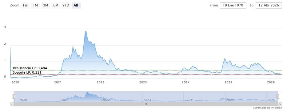 El soporte a mediano y largo plazo se encuentra en los 0.22 dólares. Mientras, los indicadores de Ei se muestran mixtos.