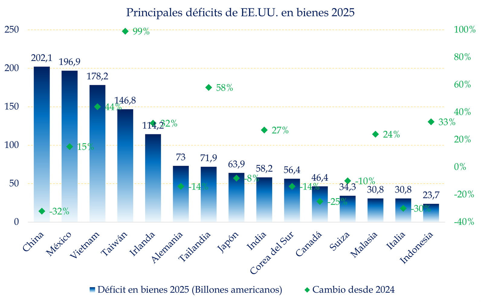 Aunque ya hablamos de ello en su día con un artículo bien concreto, quiero recordarlo y que se vea qué ha pasado en 2025 con el déficit en bienes de EE.UU.