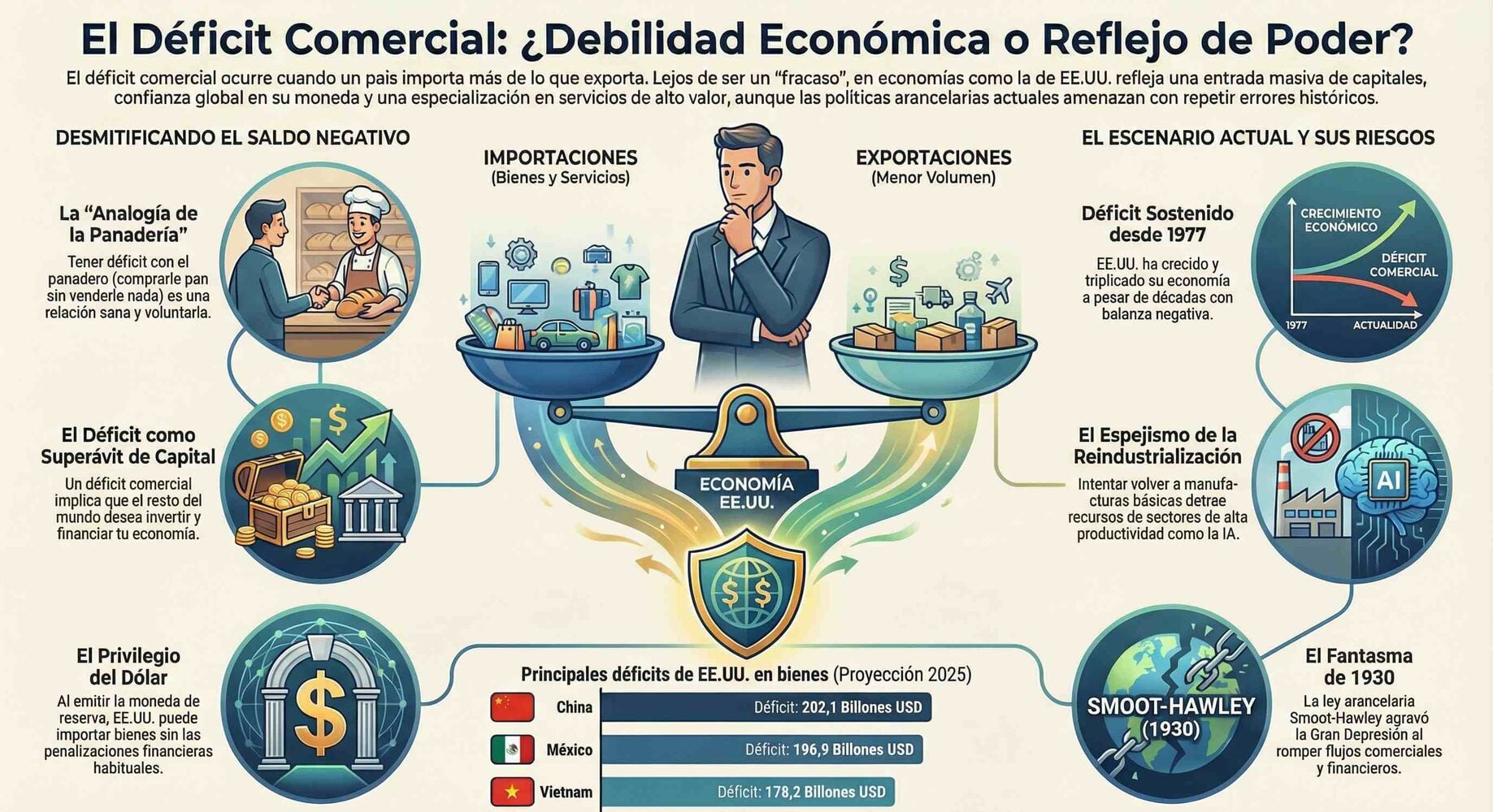 Un déficit comercial, per se, no es malo. De hecho, muchas veces es el espejo de otra cosa: la capacidad de un país para atraer capital, financiarse barato y ser considerado buen pagador. Y eso, suele ser más fortaleza que debilidad.