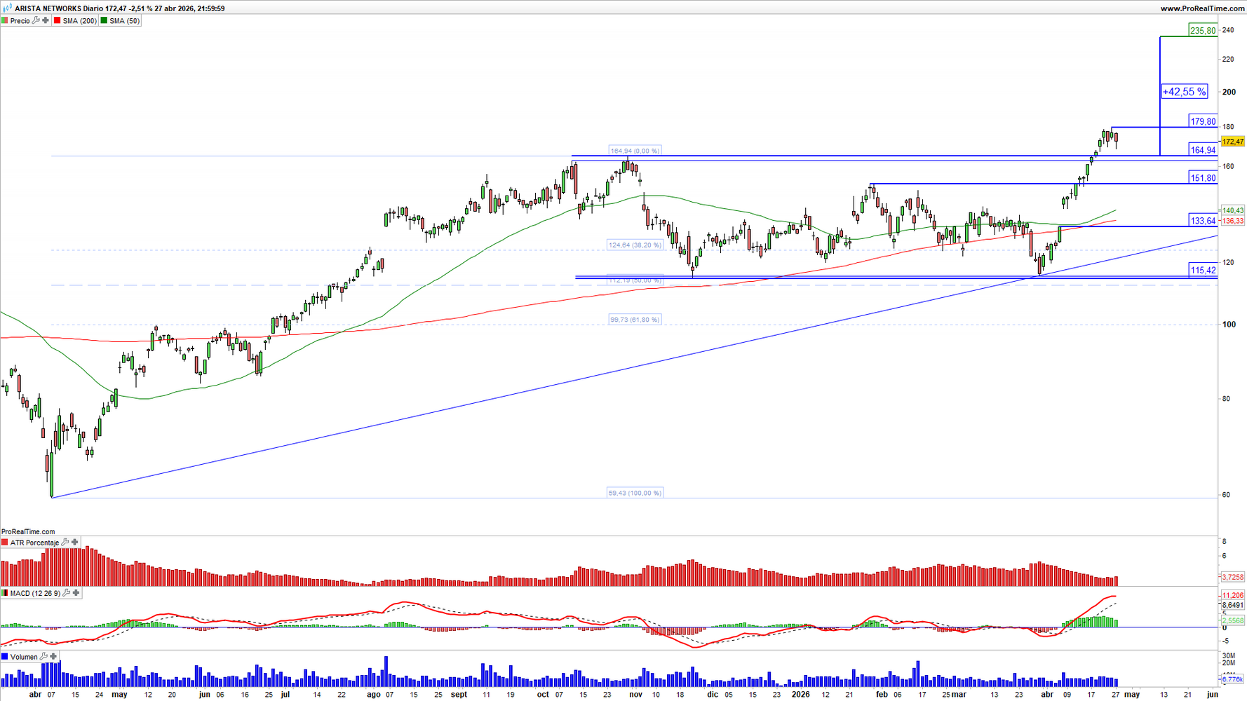 Arista Networks (ANET) en escala semanal con volatilidad (gráfico central superior), MACD (gráfico central inferior) y actividad de contratación (ventana inferior). Fuente: ProRealTime y elaboración propia.