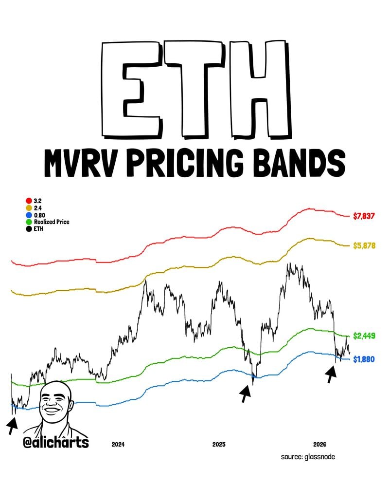 El MVRV (Valor de Mercado a Valor Realizado) compara el precio actual de Ethereum con el precio promedio que cada persona pagó por su ETH. Piénsalo como el ingreso promedio para todo el mercado. Cuando se alcanza la banda de 0.80 MVRV (actualmente alrededor de 1.880 dólares), significa que el mercado está en un estado de dolor extremo. Históricamente, esta es la zona exacta donde los vendedores se agotan y los inversores fuertes toman el control”.