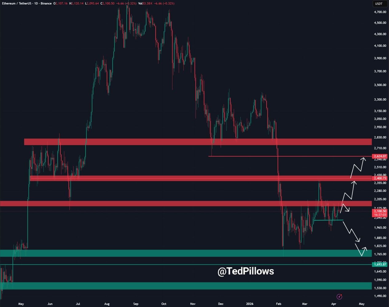 Según Pillows, Ethereum sigue rechazando la zona de 2.150 y 2.200 dólares, señalado varias zonas importantes.