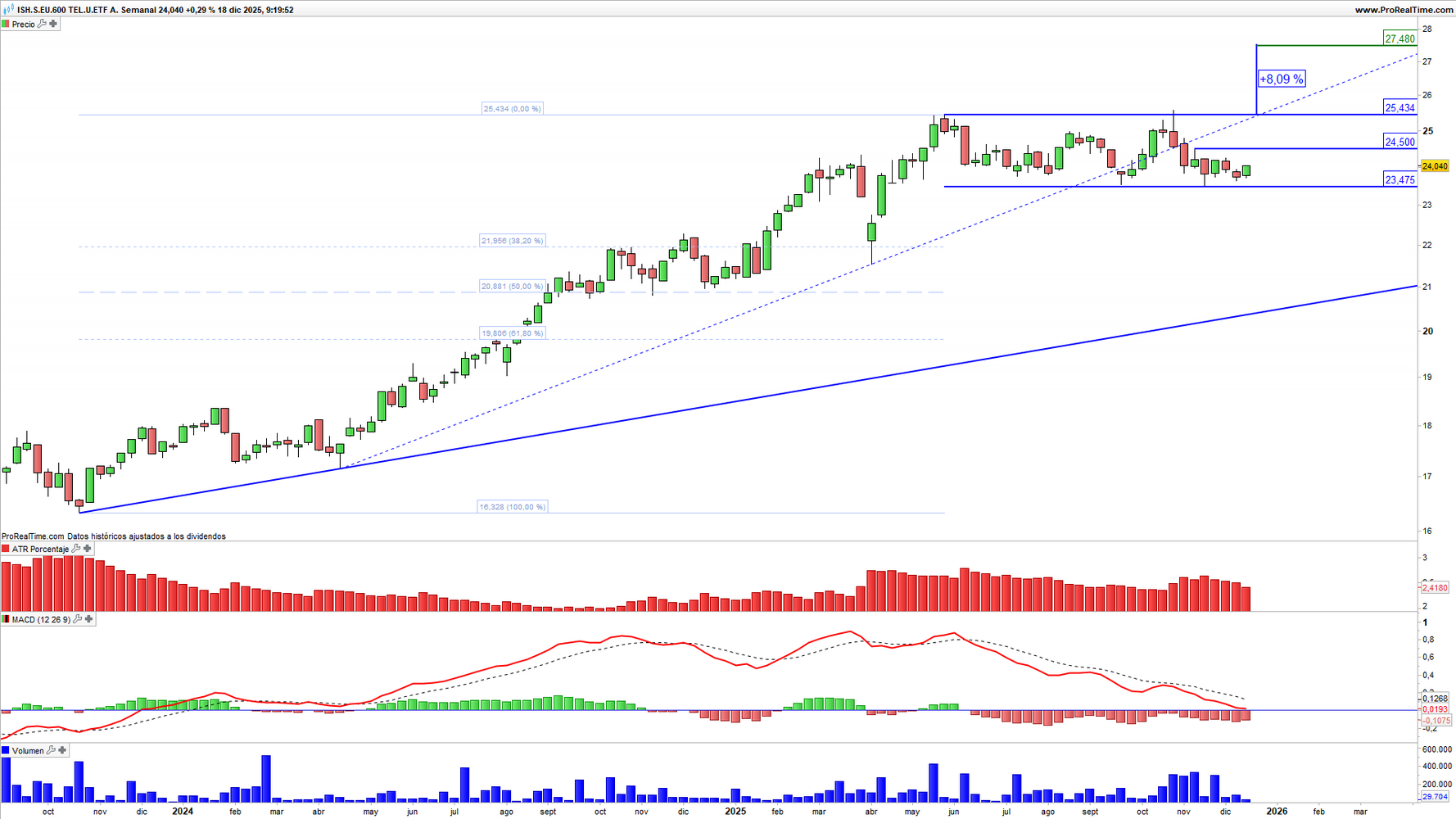 iShares Stoxx Europe 600 Telecommunications (EXV2) en escala semanal con volatilidad (gráfico central superior), MACD (gráfico central inferior) y actividad de contratación (ventana inferior). Fuente: ProRealTime y elaboración propia.