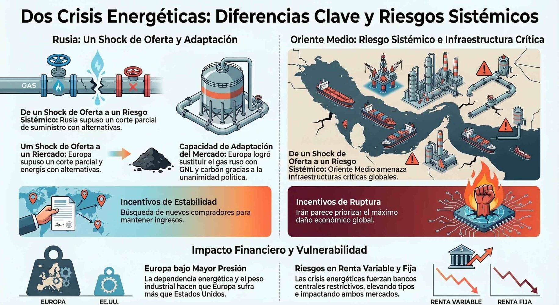 Además, Rusia buscó nuevos compradores, mantuvo relaciones con países neutrales y evitó una ruptura del sistema. En cambio, Irán parece buscar maximizar el daño económico global más que a preservarlo. Es decir, pasamos de un entorno donde hay incentivos a la estabilidad, por mal que se diesen las circunstancias de la inflación, a uno que busca romper. Y con posibilidad de que se materialice…