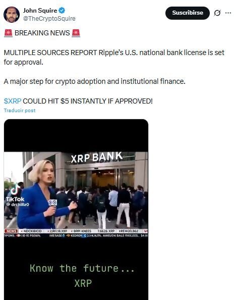 En una publicación reciente, Squire describió algunos rumores sobre la aprobación de la licencia de banco nacional estadounidense de Ripple. Sin proporcionar más detalles al respecto, añadió que un "paso tan importante para la adopción de criptomonedas y las finanzas institucionales" podría impulsar instantáneamente el token subyacente a los 5dólares.