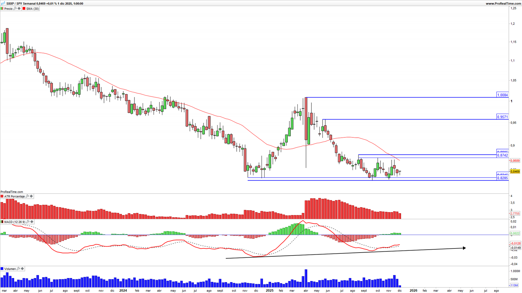En la comparativa directa entre el principal Índice europeo y el estadounidense nos encontramos que el precio se encuentra desarrollando un rango lateral en un área de soportes importantes donde el mercado europeo se hace fuerte frente al estadounidense. De este modo, se están desarrollando divergencias alcistas en el oscilador MACD, respaldando la hipótesis de un suelo favorable al mercado europeo. No obstante, para confirmar este escenario de fortaleza de Europa