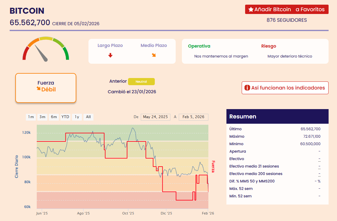 Si nos fijamos en el Bitcoin, según los indicadores de fuerza y tendencia de Estrategias de Inversión, desde 28 de Octubre el activo pasó de estar fuerte a neutral. En ese momento los inversores deberían haberse puesto en alerta, pero es que el 25 de Noviembre pasó a débil. Esa señal no deberíamos haberla obviado.