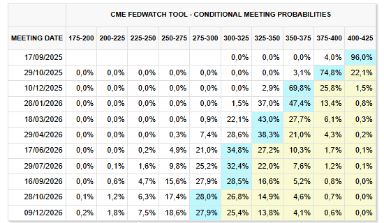 Probabilidades de recortes de tipos de interés de la Reserva Federal en los próximos meses. Fuente: CMEGroup elaboración propia.