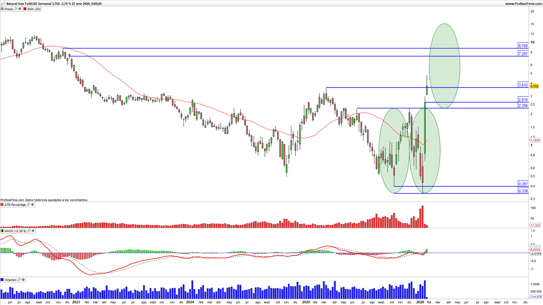 Gas Natural (NGXXXX) en escala semanal con volatilidad (gráfico central superior), MACD (gráfico central inferior) y actividad de contratación (ventana inferior). Fuente: ProRealTime y elaboración propia.