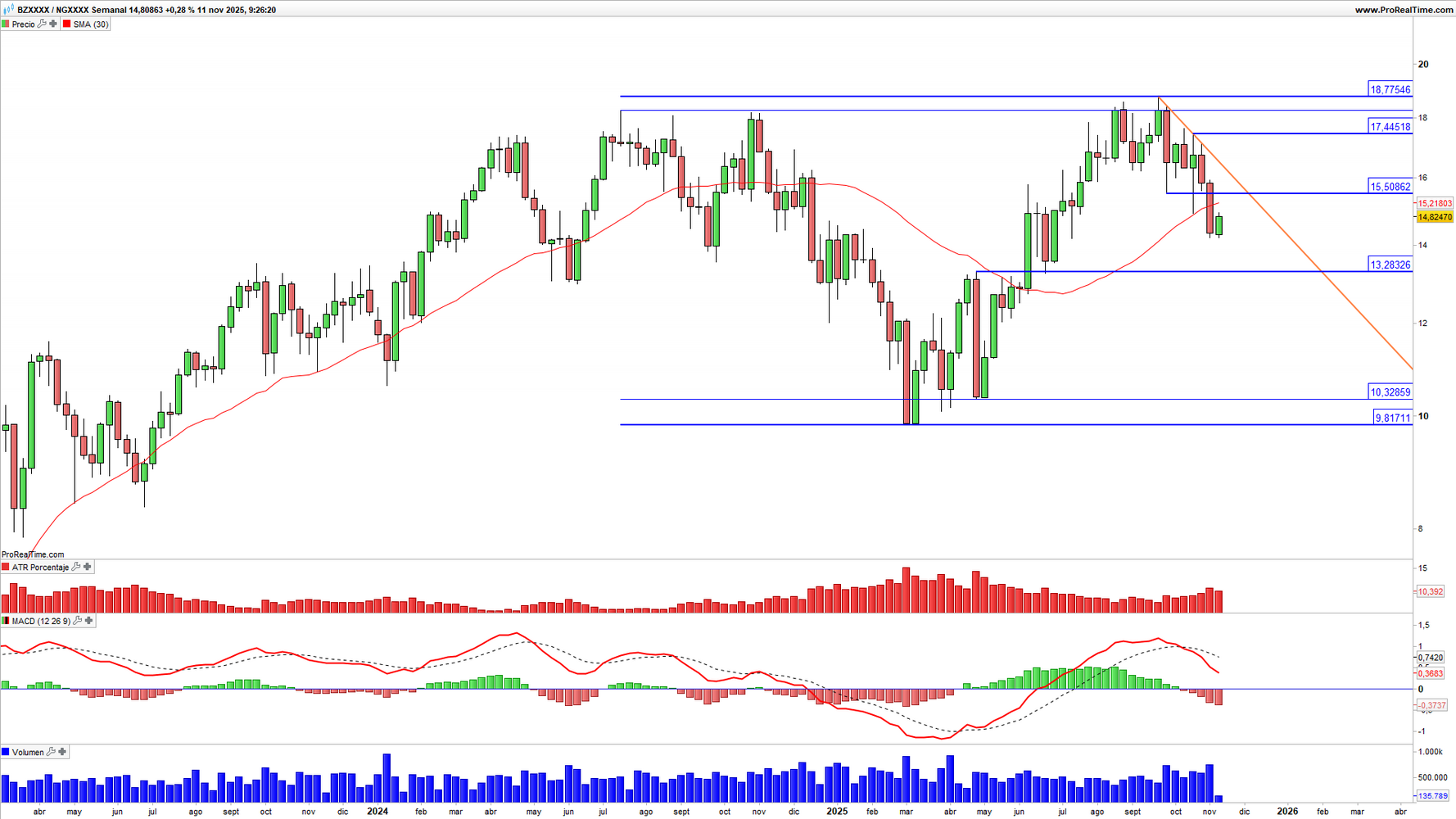 Diferencial entre el precio del Petróleo y el Gas Natural en escala semanal con volatilidad (gráfico central superior), MACD (gráfico central inferior) y actividad de contratación (ventana inferior). Fuente: ProRealTime y elaboración propia.
