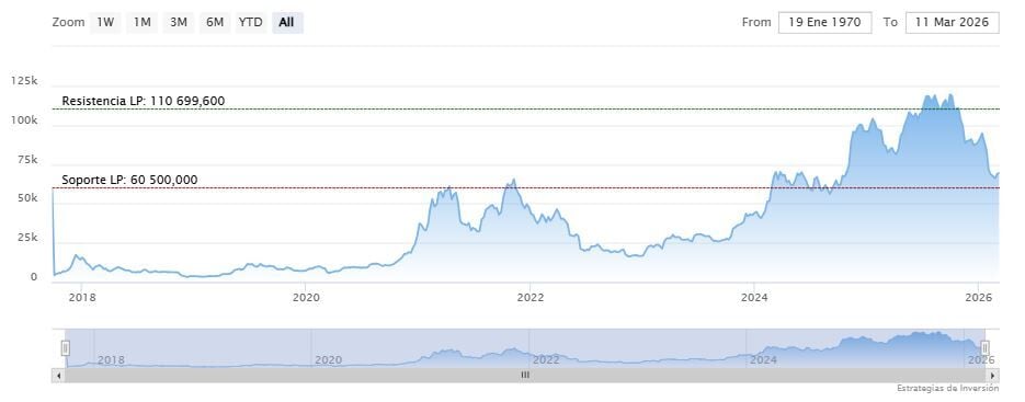 El soporte a mediano y largo plazo se encuentra en los 60.500 dólares. Mientras, los indicadores de Ei se muestran mixtos.