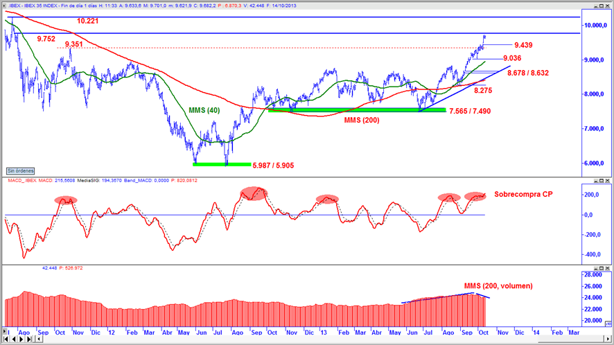 . Desde un punto de vista técnico, el Ibex 35 "desarrolla un nuevo impulso alcista, esta vez desde 9.036, y consolida por encima de la resistencia establecida en 9.351. Movimiento que permite que la serie de precios continúe construyendo una estructura de máximos / mínimos crecientes y que las medias móviles de largo plazo continúen cruzadas al alza presentando pendiente positiva", explica Luis Francisco Ruiz, director de análisis de Estrategias de inversión. (Ver: Ajustamos stops)