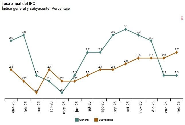 El INE ha confirmado también que la inflación subyacente (sin alimentos no elaborados ni productos energéticos) escaló una décima en febrero, hasta el 2,7%, su valor más alto desde agosto de 2024, cuando también fue del 2,7%.