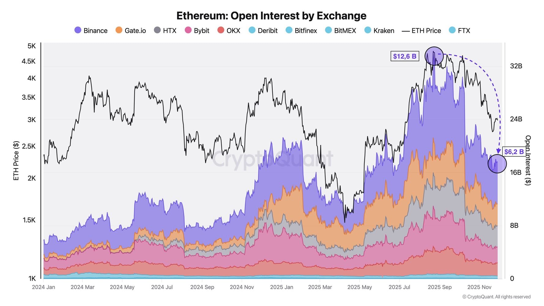 Según datos de CryptoQuant compartidos por Darkfost en X, solo en Binance el OI se desplomó un 51%, cayendo de un máximo de agosto de 12.6 mil millones a 6.2 mil millones de dólares. Esto eliminó 6.4 mil millones de dólares en posiciones.
