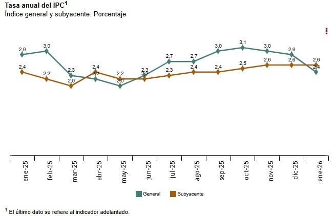 Esta evolución es debida, principalmente, a los precios de la electricidad, que suben, pero en menor medida que en enero de 2025; y a los precios de los carburantes y lubricantes para vehículos personales, que disminuyen, frente al incremento en el mismo mes del año anterior.