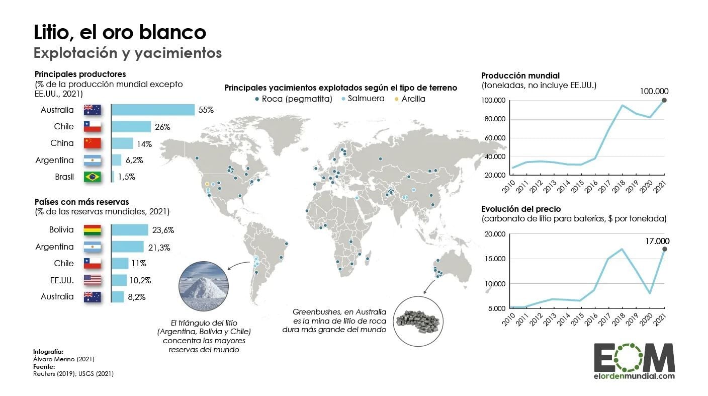 Para producir todas las baterías de litio que se demandan en la actualidad, este material se debe extraer y procesar para su uso tecnológico. Las reservas de litio se encuentran distribuidas por prácticamente todo el mundo pero estos yacimientos no están repartidos de forma homogénea. América Latina es la región con mayores reservas de litio a nivel global, aquí se encuentra el llamado triángulo del litio, que abarca el sur de Bolivia y el norte de Chile y Argentina, donde se concentran el 58% de las reservas mundiales de este mineral.