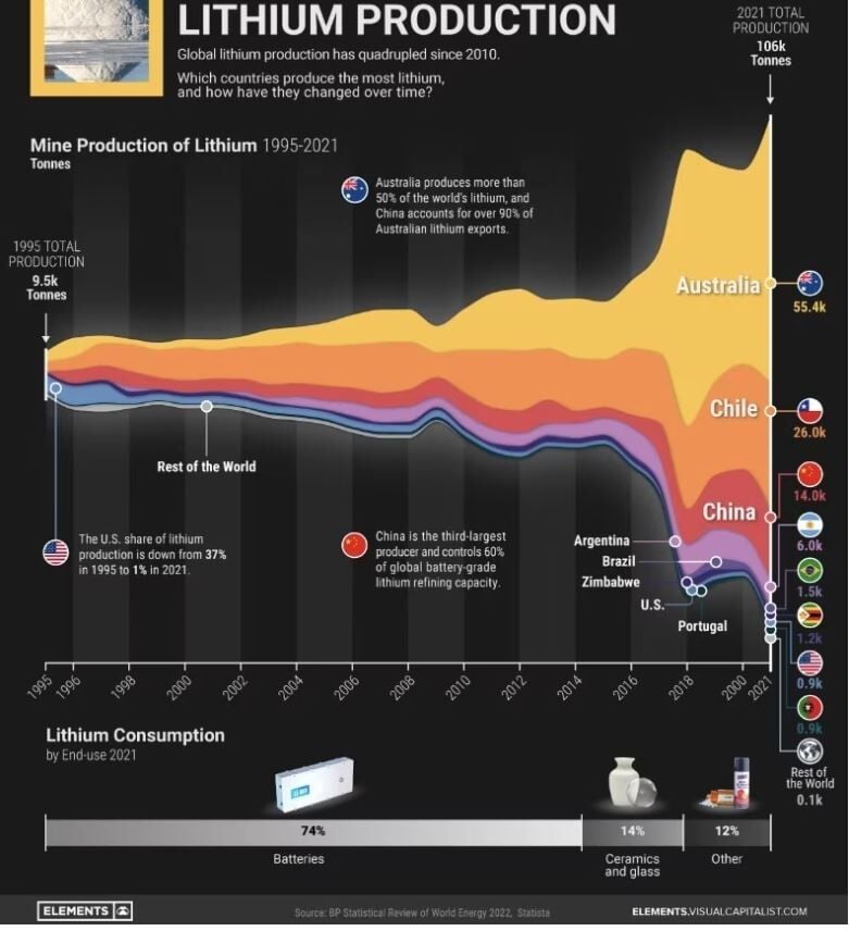 Sin embargo, tener grandes reservas no es sinónimo de ser uno de los principales productores de litio. En este caso, Australia es el líder con más de 88.000 toneladas de litio producidas durante 2024, aunque la mayoría lo envía a China para su procesamiento. Sus principales competidores se encuentran lejos de estas cantidades pues le siguen Chile y China con alrededor de 49.000 y 41.000 toneladas respectivamente. Esta diferencia entre los países con mayores reservas y los principales productores radica principalmente en la posibilidad de controlar la cadena de valor que sigue a la extracción del mineral.