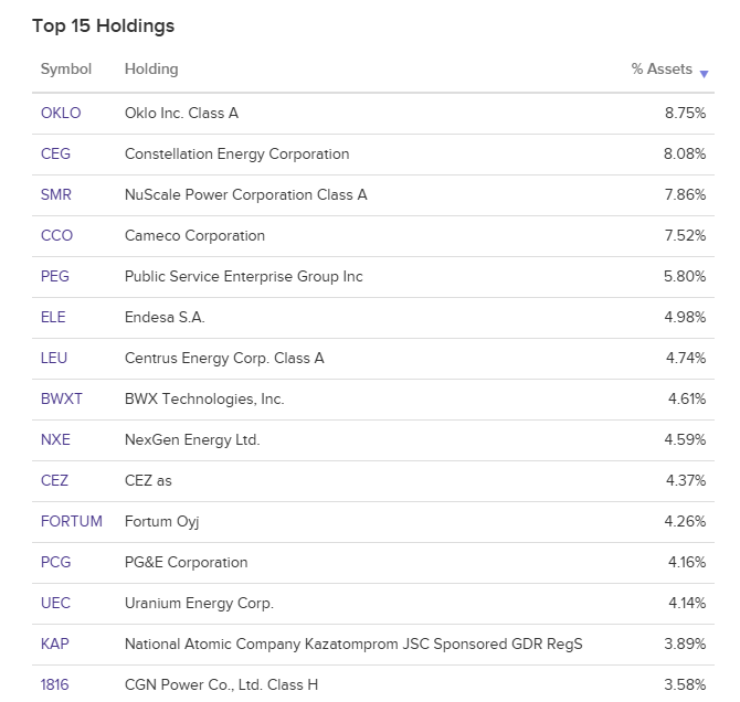 Top 15 posiciones en el ETF VanEck Uranium and Nuclear. Fuente: ETFDatabase.com elaboración propia.