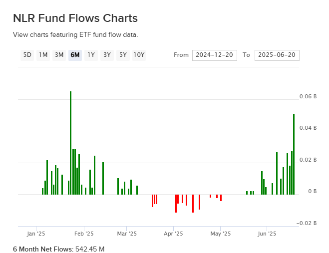 En la imagen podemos observar que, durante los últimos seis meses se han producido importantes entradas de capital en el sector de la energía nuclear, destacando especialmente las fuertes y continuas entradas producidas durante el conflicto entre Irán e Israel. En este sentido, el sector de la energía nuclear comienza a situarse en el foco del panorama energético global, por lo que las compañías que apuesten por esta forma de energía pueden presentar un comportamiento positivo en bolsa durante las próximas semanas / meses.