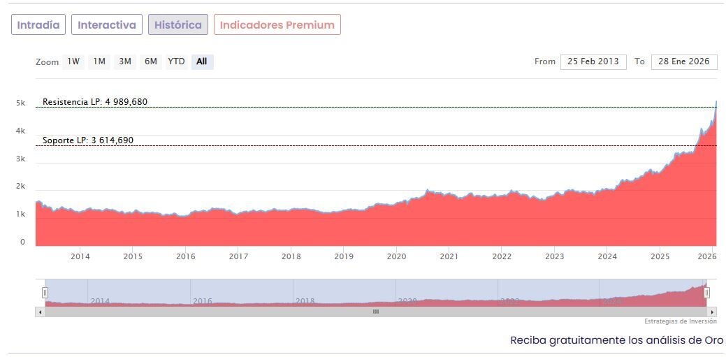 El metal amarillo superó por primera vez la barrera de los 5.000 dólares el lunes y ha subido más de un 10% en lo que va de semana, impulsado por la fuerte demanda de refugio seguro, las compras firmes de los bancos centrales y la debilidad del dólar.