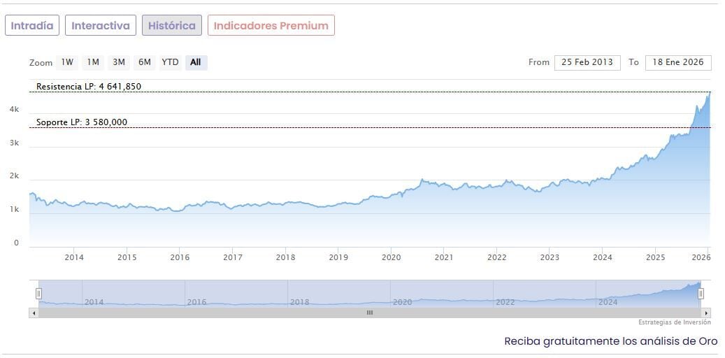 De este modo, la cotización del oro al contado llegaba a subir este lunes hasta un máximo histórico intradía de 4.697,71 dólares, con una subida del 2,22% respecto del último cierre. El precio de la onza de oro acumula en lo que va de 2026 una revalorización superior al 7%, después de despedir 2025 como su mejor año desde 1979, con una subida de casi el 70%.