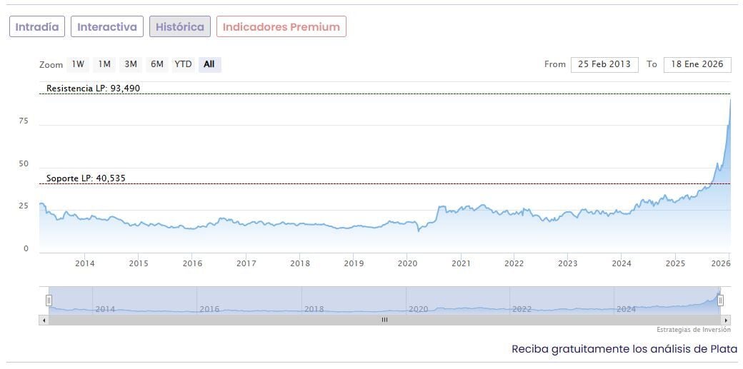 En cuanto a la plata, el metal también retoma su 'rally' y llegaba a cotizar a 94,1365 dólares, con una subida del 4,7% respecto del anterior cierre y amplía a más del 30% la revalorización en lo que va de año.