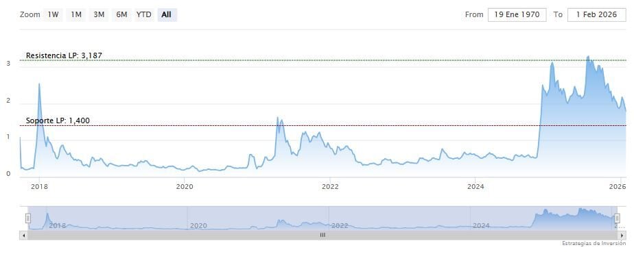 Por debajo de 1.38 dólares, el último soporte notable se sitúa cerca de 1.02 dólares, un nivel que se alinea estrechamente con la marca psicológica de 1 dólar y representa el último piso importante antes de una posible caída a territorio bajista inexplorado.