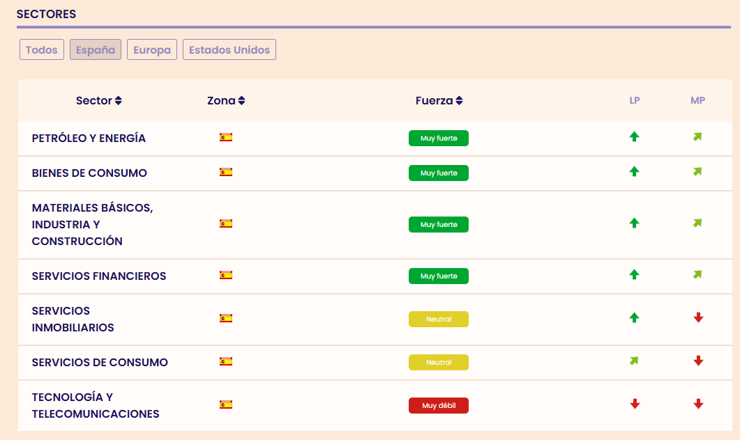 En estos momentos en España hay 4 sectores muy fuertes en bolsa según los indicadores premium de Estrategias de Inversión: Petróleo y Energía, Bienes de consumo, Materiales básicos y construcción y cómo no el sector Financiero.
