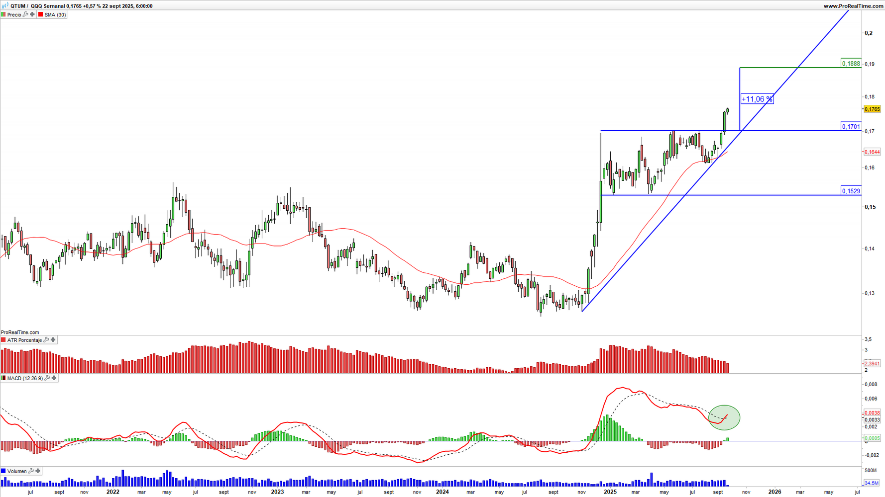 Defiance Quantum ETF (QTUM) vs Invesco QQQ (QQQ) en escala semanal con volatilidad (gráfico central superior), MACD (gráfico central inferior) y actividad de contratación (ventana inferior). Fuente: ProRealTime y elaboración propia.