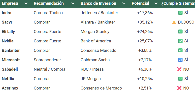Vamos a repasar las últimas recomendaciones de los bancos de inversión de acciones españoles y de EEUU, y posteriormente veremos si esas recomendaciones cumplen nuestro sistema de inversión.