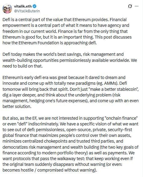 El cofundador de Ethereum (ETH), Vitalik Buterin, se ha referido al futuro del blockchain en X. En concreto ha señalado que se dirige hacia un “DeFi Real”, el cual busca eliminar las dependencias de los usuarios dentro de los protocolos y acercar la red más a los inversores institucionales sin perder su libertad y descentralización.