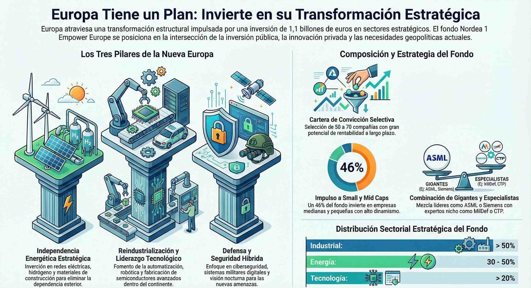 Europa está canalizando más de 1,1 billones de euros hacia sectores estratégicos: desde la independencia energética hasta la ciberseguridad. Y Nordea ha sacado este fondo para aprovechar un momento de posibles rentabilidades más que buenas.