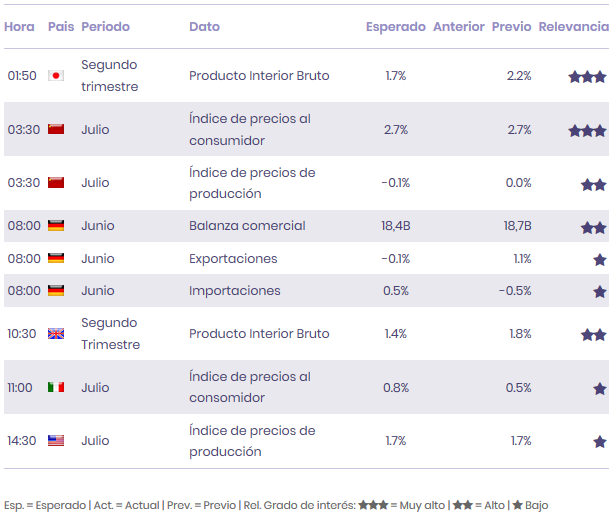 La semana termina con referencias importantes. Un día después de que China sorprendiese con sus positiva balanza comercial, este viernes los inversores conocerán qué tanto de las exportaciones alemanas se están viendo afectadas en el momento que se publique la balanza comercial germana. En Europa, especial importancia cobrará el dato de PIB inglés, tras el endurecimiento del discurso del Gobierno británico para lograr el brexit.