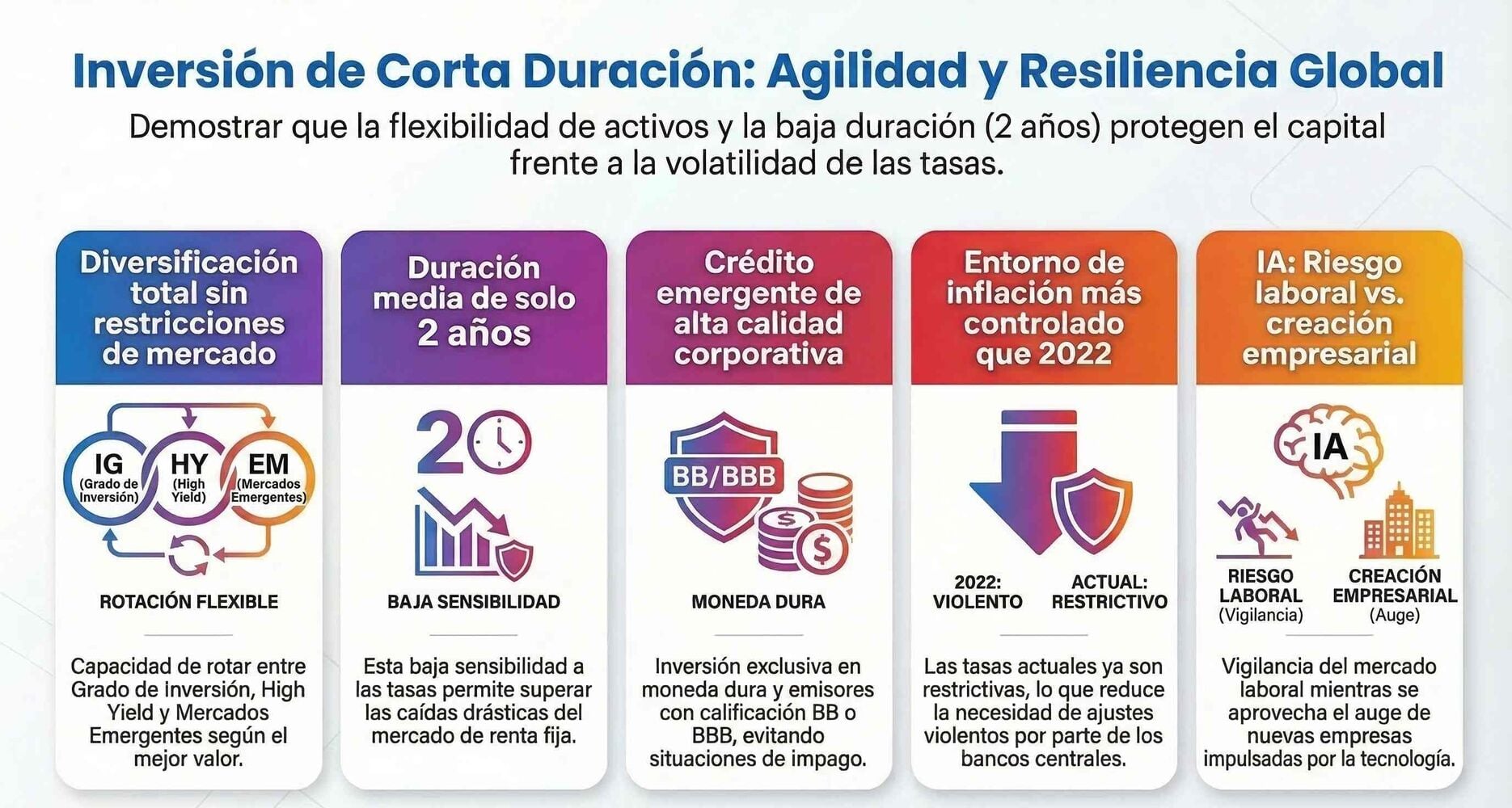 - Duración corta para controlar la sensibilidad a los tipos de interés.