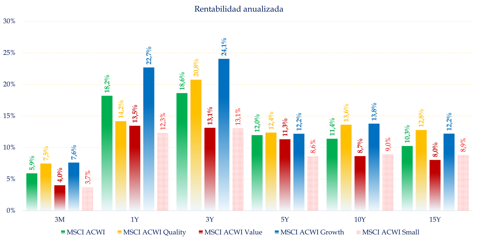 - La rentabilidad anualizada de todos los estilos del índice MSCI ACWI en los últimos 10 y 15 años es sólida. El índice general, que recoge empresas de todo el mundo, ha ofrecido una rentabilidad media del 10,3% en los últimos 15 años. Incluso el estilo más rezagado, el value, ha ofrecido un más que aceptable 8% anualizado a 15 años vista. Hasta los menos buenos aprueban con nota.