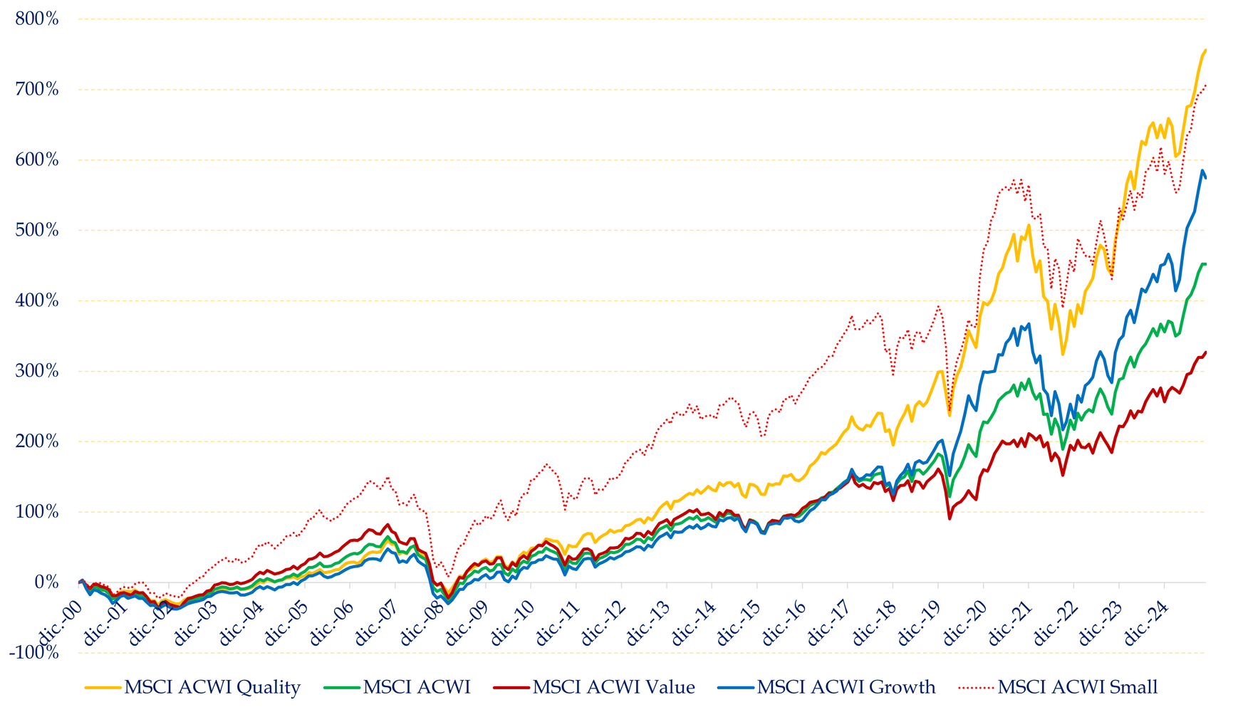 - El gráfico histórico lo deja aún más claro. Desde la crisis de 2008, el quality ha marcado la trayectoria ascendente más sólida. Esta es la típica imagen que vale más que cualquier explicación. Mírala y saca tus conclusiones.