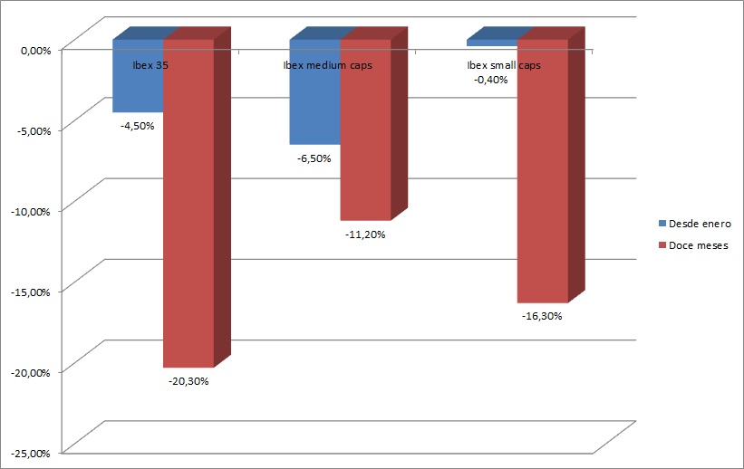 Sin embargo desde el uno de enero, han sido las empresas medianas las que peor lo han hecho, incluso a pesar del lastre de los bancos. Así, el Ibex medium caps cede más de un 6,5%, el Ibex 35 retrocede un 4,58% y el Ibex small caps apenas cae un 0,4%.