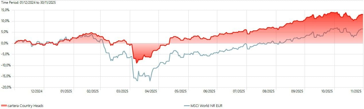 Por ejemplo, la ratio de Kurtosis, que mide el peso de las colas de la distribución, es decir, la probabilidad de rentabilidades extremas es de -0,09, frente a 1,05 del MSCI World. Por simplificar, Kurtosis alta y positiva indica más riesgo de rentabilidades extremas. Cuanto más se acerca a 0 es más normal. Y si es negativa, quiere decir que tiene menos eventos raros de lo habitual. Otra ratio que mido es Sortino. Esta ratio es como Sharpe, pero solo se ajusta al riesgo negativo. Es decir, penaliza la volatilidad en caídas, no la volatilidad positiva. Así, cuanto más elevada sea esta ratio, mejor. A los inversores muy prudentes les aconsejo utilizar mejor esta ratio que Sharpe… Pues bien, la cartera de los Country Heads es 2,2, frente al 1,9 del MSCI World. Esto quiere decir que la cartera protege bastante mejor frente a caídas, generando más rentabilidad por cada unidad de riesgo que se asume. Pero también sale mejor la cartera en VaR y otras…