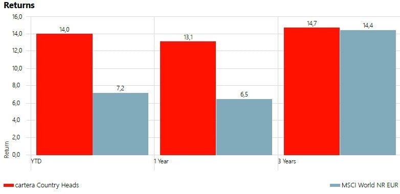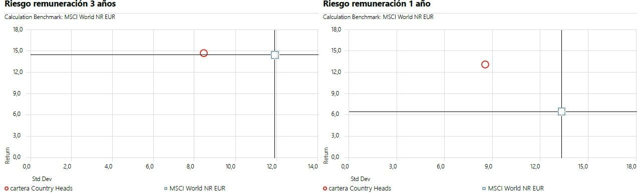 Pues resulta que esta cartera, con mucha menos ponderación de renta variable bate al MSCI World (3 y 1 año, respectivamente). Pero no solo bate la rentabilidad del MSCI World, sino que lo hace con una volatilidad casi 4 puntos por debajo. Para que luego digan que la gestión activa no sirve.