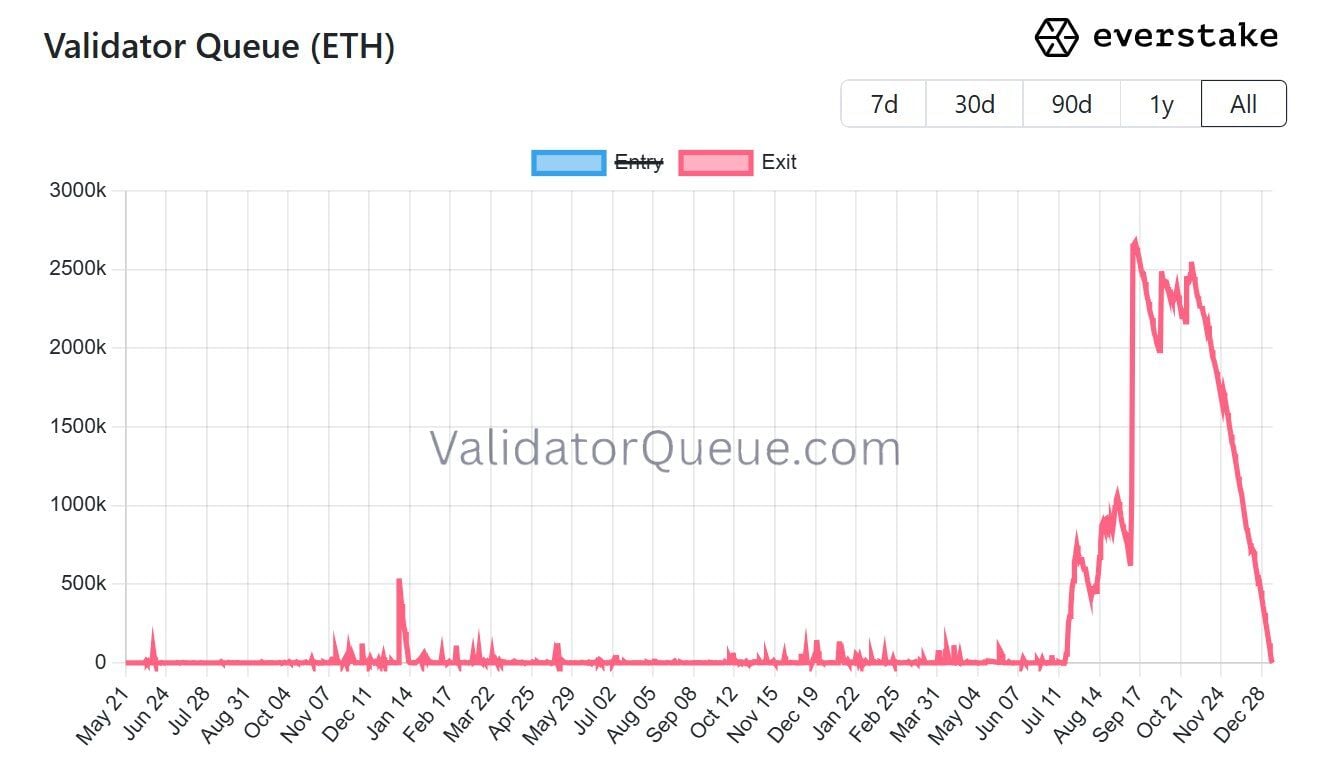 Siempre hemos dichos que los datos on-chain nos dicen mucho sobre una criptomoneda, como es el caso de la cola de salida de validadores de Ethereum (ETH) Según Everstake en X la misma se ha reducido a cero, lo que elimina la presión de venta sobre la criptomoneda.