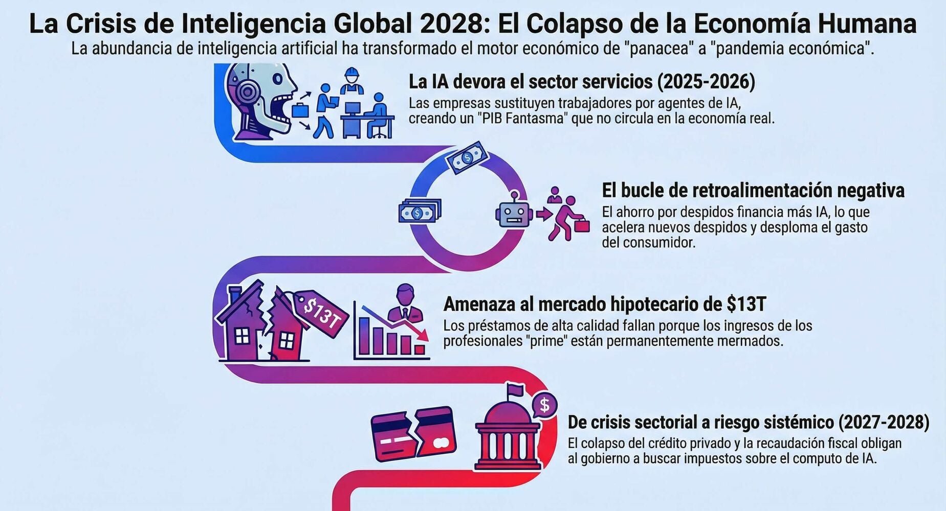 El informe sintetiza la trayectoria proyectada de la Crisis de Inteligencia Global de 2028, un escenario donde la abundancia de inteligencia artificial (IA) transforma la economía global de una fuente de euforia financiera a una espiral de contracción sistémica. Lo que comenzó como un auge de productividad y márgenes corporativos récord en 2026, puede derivar en junio de 2028 —fecha señalada en este informe— en una tasa de desempleo del 10,2% y una caída del 38% en el S&P 500 desde sus máximos. Lógicamente esto ha llevado a ciertos movimientos de pánico.