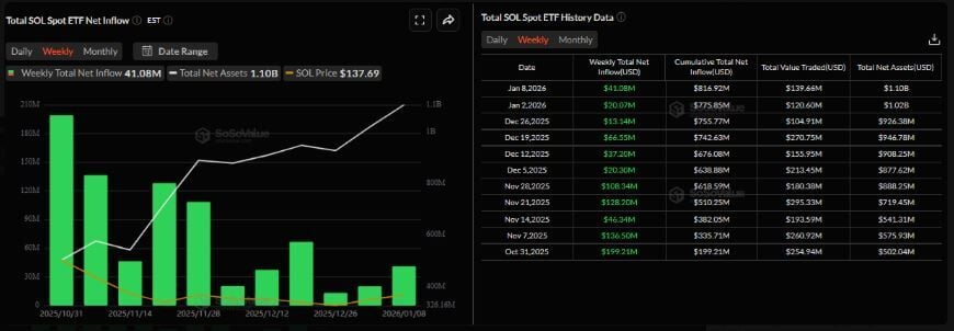 Los datos de SoSoValue muestran que los ETF al contado de Solana registraron una entrada semanal neta de 41,08 millones de dólares hasta el jueves, la entrada semanal más alta desde mediados de diciembre, y continúa su racha semanal desde su lanzamiento el 28 de octubre. Además, los activos netos totales alcanzaron los 1.100 millones de dólares en lo que va de semana, lo que sugiere una creciente demanda institucional. Si las entradas continúan y se intensifican, SOL podría experimentar un repunte en su precio.