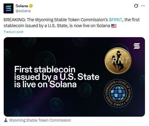 Durante el mismo período, según la Comisión de Tokens Estables de Wyoming, Frontier Stable Token (FRNT), la primera stablecoin emitida por un estado de EE. UU., se lanzó en la red Solana, lo que demuestra la creciente confianza institucional en la infraestructura de Solana.