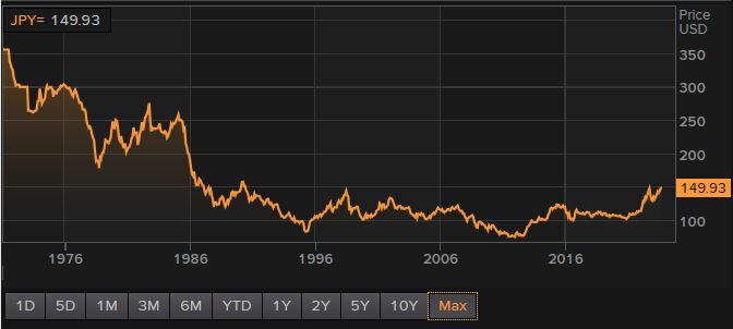 Pero el yen se está devaluando como consecuencia del diferencial de tipos de interés existentes entre la Reserva Federal de EEUU y el Banco Central de Japón. Tras caer por debajo de la marca psicológica de los 150 yenes por dólar, el gobierno nipón acordó tomar medidas contra los movimientos excesivos de su moneda, sin descartar ninguna opción. El yen ha perdido ha perdido más de un 25% frente al dólar en el último año, retrocediendo a cotas de hace 25 años.