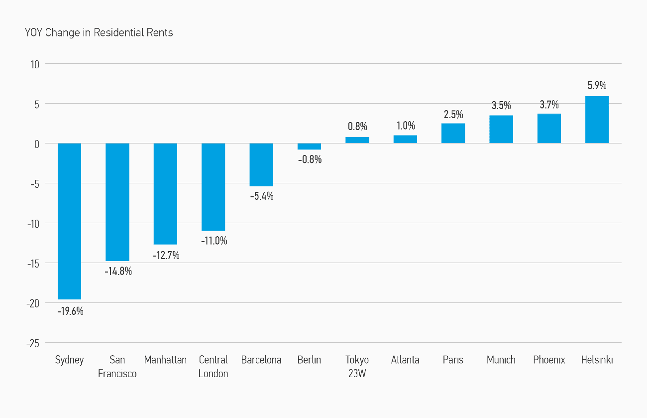 En el ámbito residencial, esta fase de reposicionamiento resulta evidente: con los alquileres en receso en capitales como Londres, Nueva York, Sídney, San Francisco o Barcelona y en ratios alcistas en sus extrarradios y suburbios en la práctica totalidad de los estados de la primera potencia global, los del Norte de Europa y en Japón. Con aumentos de la oferta inmobiliaria del 7% en las principales ciudades del espacio industrializado.
