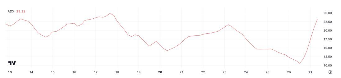 El ADX de Cardano ha subido bruscamente hasta 23.2, frente a los 10.5 de ayer, lo que indica que el mercado ha pasado de una tendencia casi inexistente a una más definida.