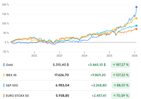 El precio del oro se dispara y acumula una rentabilidad superior al 187% en tan solo 5 años. Se ha convertido en el valor estrella sin duda en el mercado, por encima incluso del Ibex 35 que ha ha hecho 2 años de escándalo en bolsa.